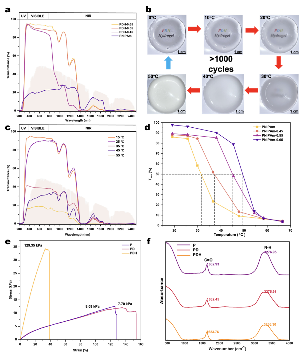 针对这一问题,吕松研究团队设计并合成了一种基于复合交联网络结构的热响应型水凝胶(PDH hydrogel),通过自由基聚合由N-异丙基丙烯酰胺(NIPAm)、N,N-二甲基丙烯酰胺(DMAA)和2-羟基乙基丙烯酸酯(HEA)制备而成。该水凝胶在光学与力学性能上均实现显著突破,表现出高可见光透过率(Tlum= 97.92%)、强太阳能调制能力(ΔTsol= 81.70%)以及优异的力学强度(粘附强度54.63 kPa、拉伸强度34.31 kPa、弹性模量约129.35 kPa),成功实现多重性能的协同提升。
