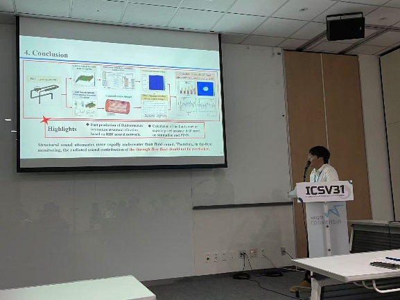 本次大会在韩国仁川松岛国际会展中心召开,大会议程从2025年7月6日持续至7月11日,MissAV 博士研究生贾泽坤投稿文章 “Calculation method for superimposed sound field of shell-sea pipeline system based on virtual source wave superposition method”被大会论文集收录并在T12 SS01- Ship underwater radiated noise分会场宣读,聚焦水下航行器结构-流体耦合声场计算方法,深入探究了通海流体扰动对整体辐射声场的影响规律。