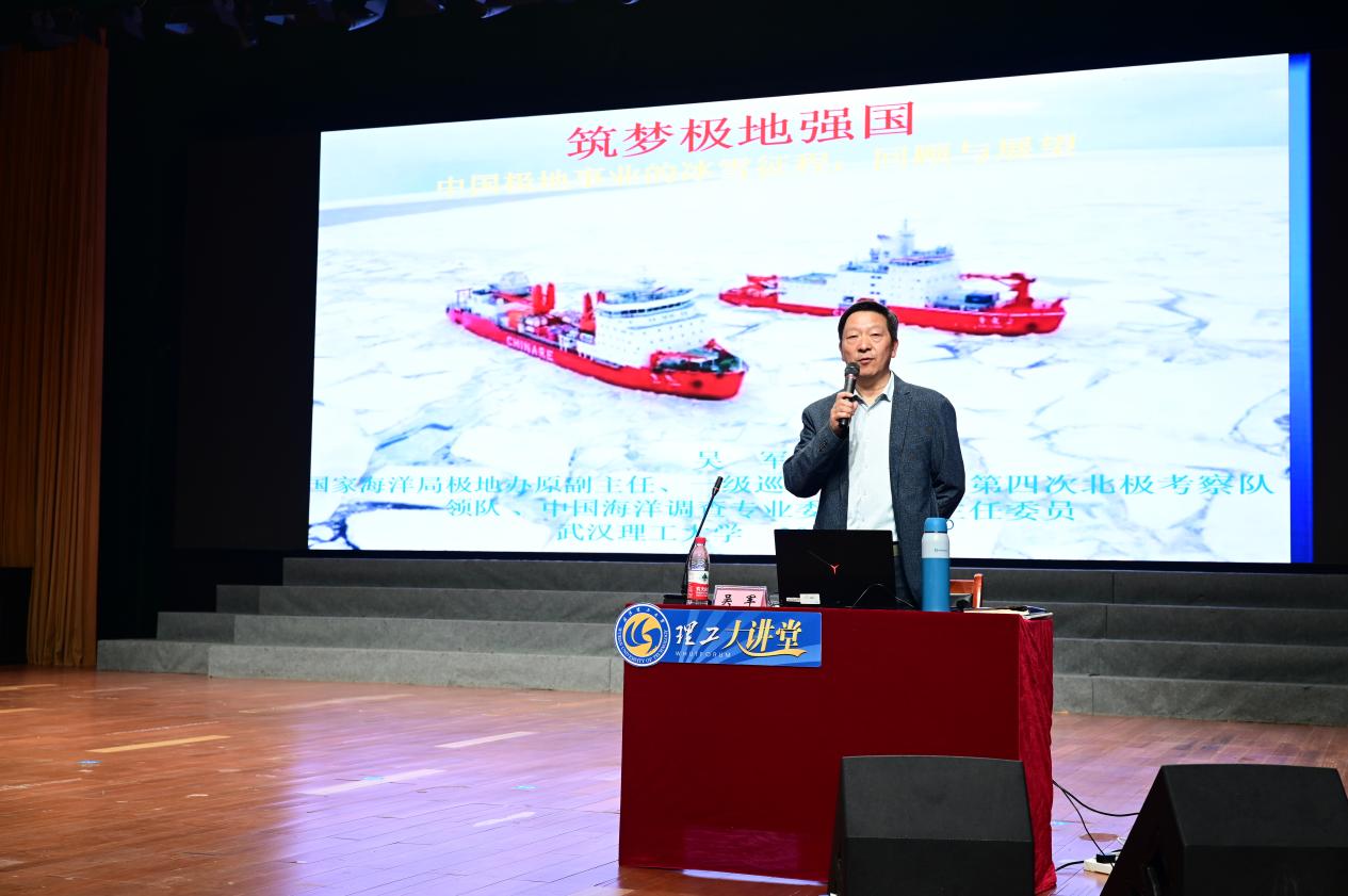 从北极极点的五星红旗到南极冰原的科考站点,中国极地科考事业40年从无到有、由弱到强的跨越,始终印刻着吴军的奋斗足迹。讲座中,吴军围绕南北极战略价值、我国极地科考发展历程、国际极地治理格局与未来展望展开系统分享,结合亲身科考经历,生动讲述了一代代极地工作者勇斗极寒、拼搏奉献的奋进故事,深刻阐释了“爱国、求实、创新、拼搏”的极地精神,解读了我国“认识极地、保护极地、利用极地”的发展理念与海洋强国建设的时代内涵。吴军强调,“要心怀‘国之大者’,深耕专业‘看家本领’”,他鼓励青年学子主动把个人理想追求融入国家发展大局,以专业所学投身交通强国、海洋强国、能源强国建设,在向海图强的征程中书写青春华章。