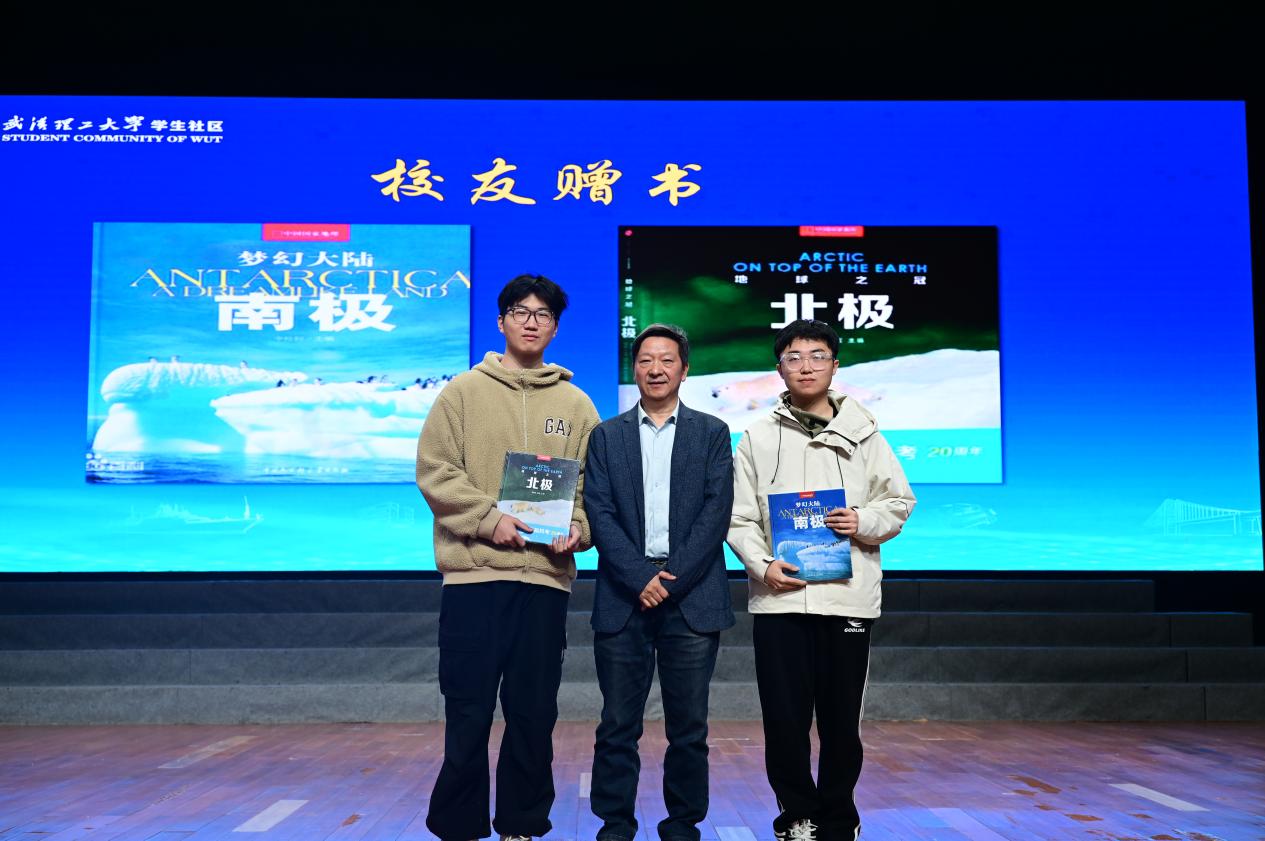 活动现场,吴军向学生代表赠送《南极》《北极》著作,传递极地探索的初心与力量;学生代表为吴军、莫鉴辉两位校友献上鲜花,致以诚挚敬意。