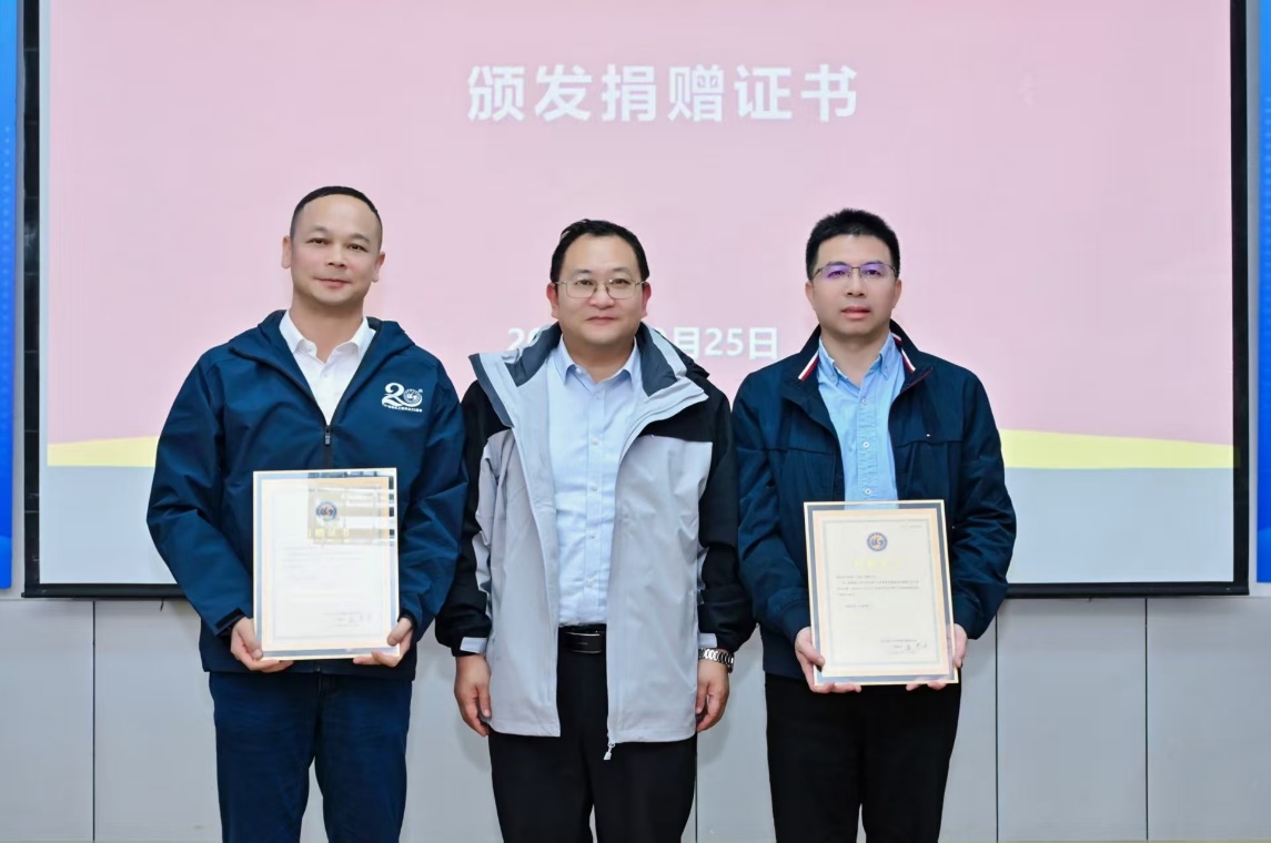 会上校方与攀升科技集团、微进电子科技(上海)有限公司签署捐赠协议。李晓彬向陈孝兵、周县锋颁发捐赠荣誉证书。